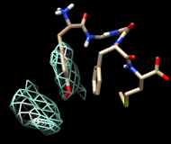 You will see two main blobs or volumes representing probable positions of the Tyr ring relative to the Phe ring, similar to the upper set of images at right. The larger volume represents μ-type conformations and the smaller represents δ-type conformations.