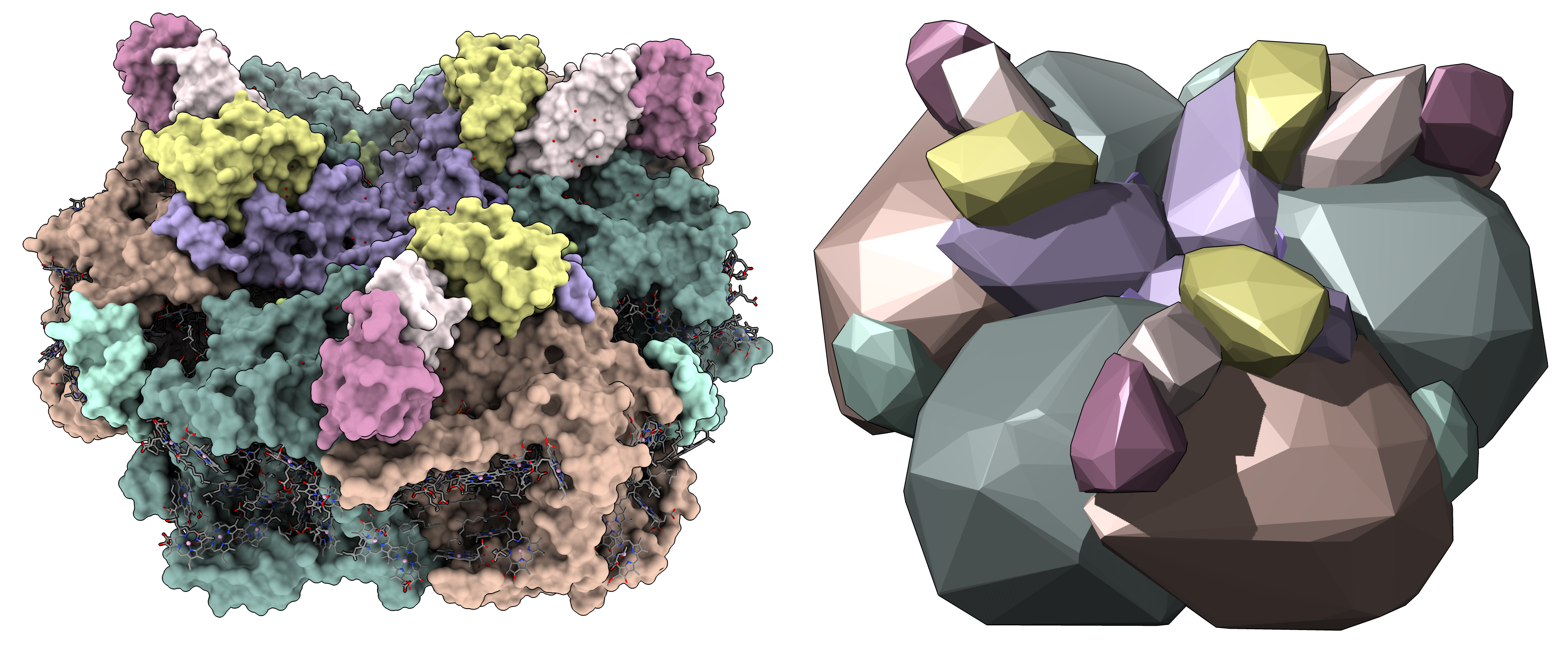 Here is a photosystem 1 shown as a solvent excluded molecular surface (6 million triangles) compared to convex hull surfaces for each protein (3000 triangles) giving it a mineral look.