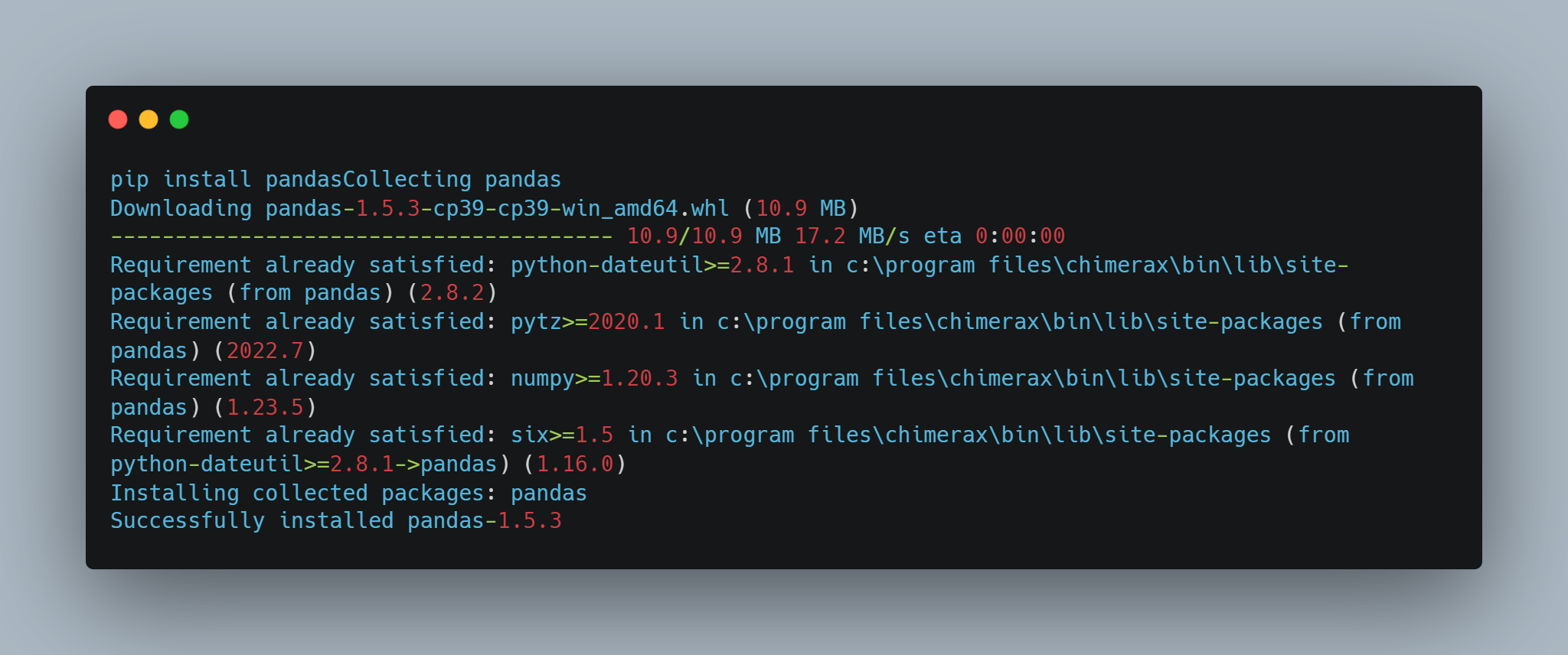 You can install packages into ChimeraX with its “pip” command, e.g. “pip install pandas”.