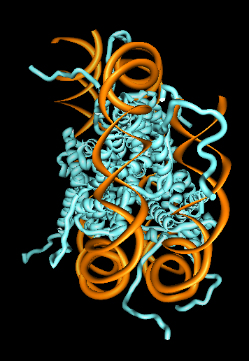 A theoretical model of a chromatin fiber is shown. This length of 30 nm fiber would package about 20,000 base pairs of DNA. It is made from 100 nucleosomes (PDB entry 1eqz) with centers arranged helically and orientations somewhat randomized. The white tablets show the arrangements of the nucleosomes in a more schematic way. The bottom images show a ribbon diagram of a single nucleosome face on and edge on.
