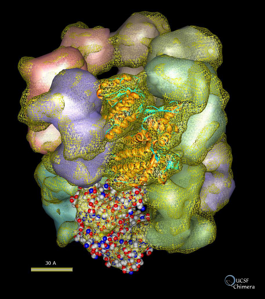 The image shows 14 copies of a monomeric GroEL crystal structure docked to a 10.3 angstrom electron microscope map. The functional GroEL is a 14-mer. Three domains of the monomeric crystal structure were docked separately. The microscope data is shown as a yellow mesh. The 12 semi-transparent surfaces are docked monomers. One monomer is shown as a ribbon, and one monomer shows the atomic structure with atoms as spheres.