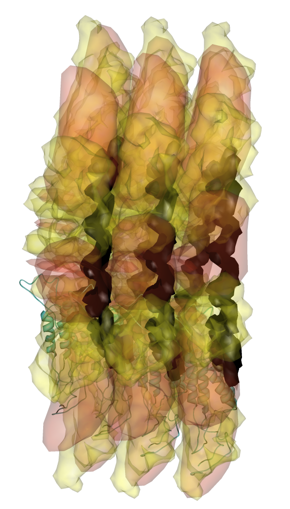 Three turns of the helical ribgrass mosaic virus (pdb identifier 1rmv) are shown using the Chimera multiscale extension. The three turns contain exactly 49 subunits. A complete virus has approximately 2100 subunits. The black coil is RNA. The red and yellow are the same protein represented using transparent surfaces with different resolutions. Different colors were used so that the subunits are easily distinguished. The blue ribbon shows the secondary structure of 3 copies of the protein.