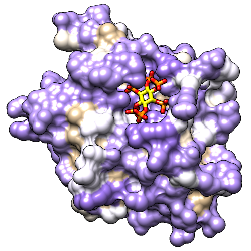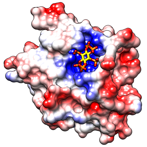 Command: delete :.aThe ligand IHP looks somewhat like a distorted snowflake. IHP binds to a conserved site lined with positively charged groups. The ligand heteroatoms and a nearby sodium ion are colored by element. Show the molecular surface, hide the ion, make sticks fatter, and make ligand carbons yellow: