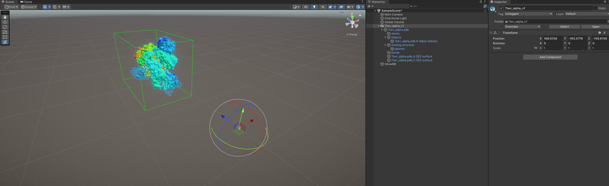 We are indeed using a third party Asset because the Khronos Group abandoned the GLTF plugin for Unity. https://github.com/Siccity/GLTFUtility But I also tested the gLTFast Plugin used in "LookSee". It shows the same weird placement of the pivot in Unity (screenshot attached). I've wrote a little script to create a bounding box from all the mesh bounding boxes to check if our model has some weirdly placed parts. The bounding box looks fine but the pivot is still way off (screenshot attached). All "subobjects" also have the pivot on the exact same position (no matter if in a Unity Prefab or not). I don't understand why the pivot is off or why Unity and Blender create it that way. But files from other 3D modelling programs don't have that issue if exported correctly. Is it possible that the Protein is translated in ChimeraX and this translation is carried into the export? That's a problem in other 3D modelling programs. The user has to select single object export and not whole scene export since that would export the global position (which might not be 0/0/0). Just a guess. I'm new to ChimeraX and I'm just a media informatics student on an internship, trying to get some 3D models out of ChimeraX. So I might be missing something. Link to the protein: https://www.rcsb.org/structure/7lwv Lukas Sandhop (u34216, MINF-18) Hochschule Harz ----- Ursprüngliche Mail ----- Von: "ChimeraX" <ChimeraX-bugs-admin@cgl.ucsf.edu> An: goddard@cgl.ucsf.edu, "Lukas Sandhop" <u34216@hs-harz.de> Gesendet: Dienstag, 7. November 2023 22:22:24 Betreff: Re: [ChimeraX] #10108: GLTF centering #10108: GLTF centering -----------------------------------+------------------------- Reporter: u34216@… | Owner: Tom Goddard Type: defect | Status: assigned Priority: normal | Milestone: Component: Input/Output | Version: Resolution: | Keywords: Blocked By: | Blocking: Notify when closed: | Platform: all Project: ChimeraX | -----------------------------------+------------------------- Comment (by Tom Goddard): I tried adding a ChimeraX .glb file to a Unity (2023.1.16f1) scene and it does not appear Unity natively handles GLTF files. So I'm not sure what you mean by it doesn't get the right pivot in Unity. I guess you are using some third party GLTF Unity asset.