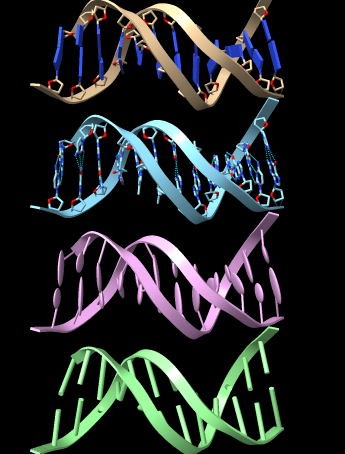 (a) is essentially a ligand, (b) abstract, but easy to see twist between base pairs (and eventually the pucker). (c) more abstract. (d) very abstract. I'm not sure we need both (c) and (d).