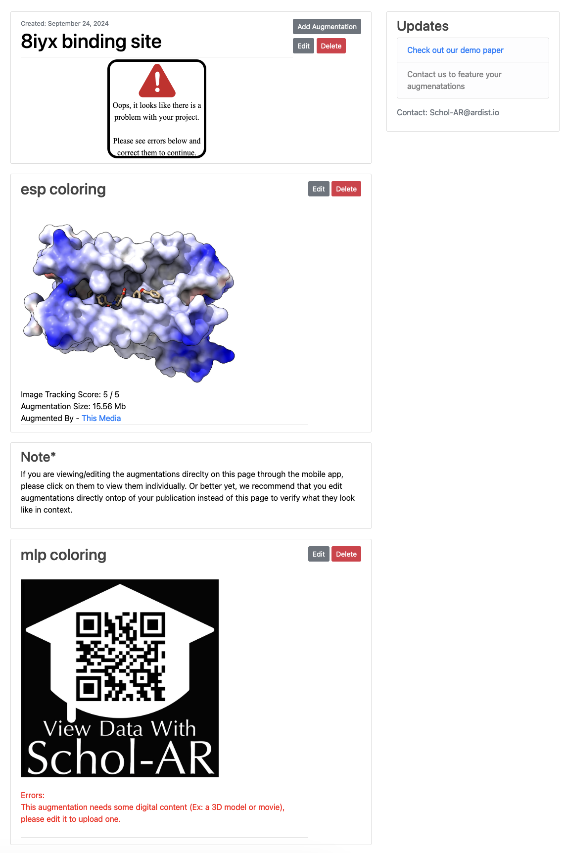 The default behavior for a Schol-AR augmentation that is missing an augmented file is to force the qr as the target image and display the warning seen in the attached screenshot. This issue has to do with an augmentation getting created for a file that is too big to be uploaded in the first place. Fix is in place to prevent creating an augmentation for a file that is too large. The ticket will be closed when version is released.