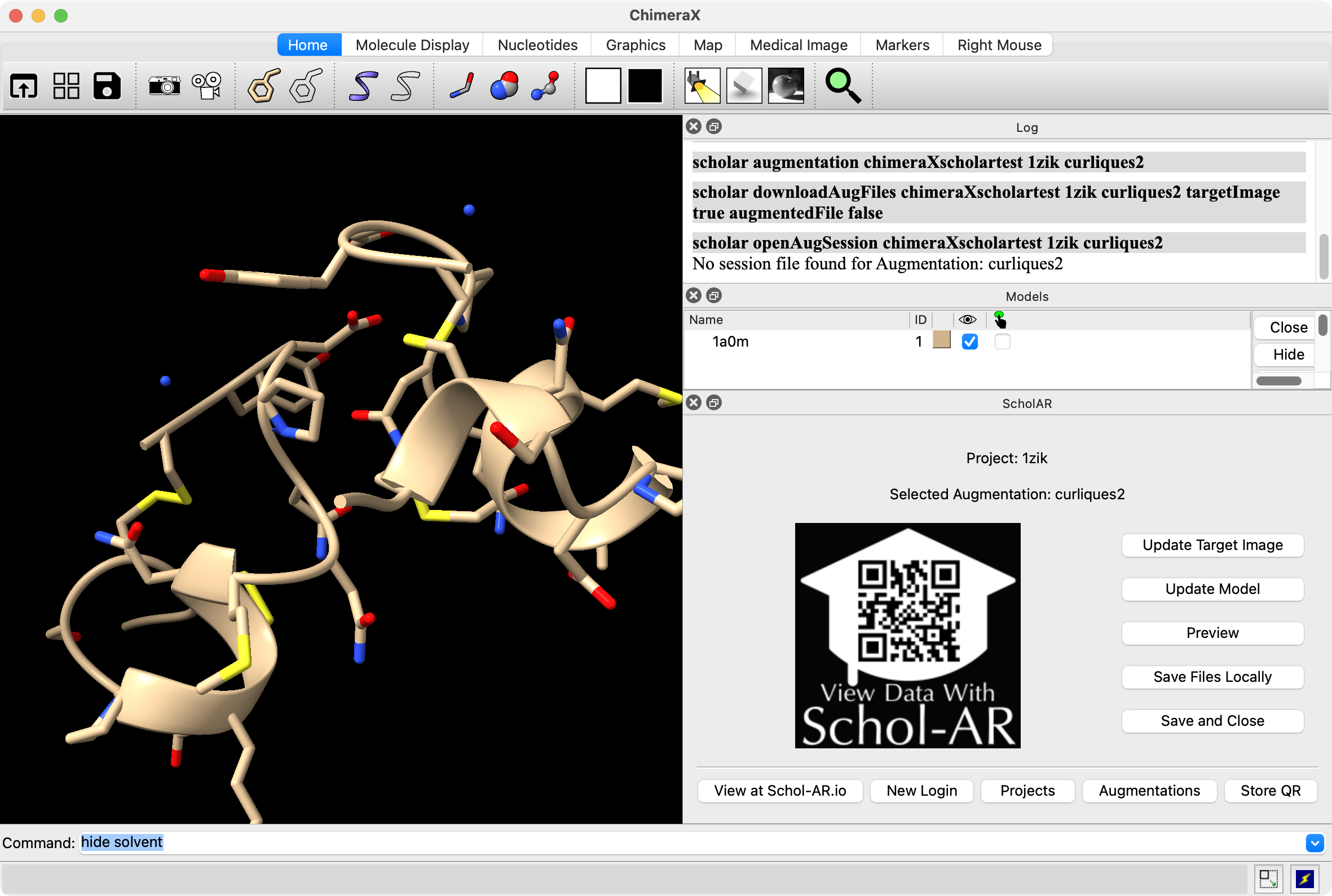 The following bug report has been submitted: Platform: macOS-14.6.1-arm64-arm-64bit ChimeraX Version: 1.9.dev202409260414 (2024-09-26 04:14:30 UTC) Description Schol-AR gives "no session file found" even when I create a small augmentation. Example commands: open 1zik rainbow ui tool show ScholAR scholar login chimeraXscholartest scholar project chimeraXscholartest 1zik projectType paper discUrl "" scholar augmentation chimeraXscholartest 1zik "rainbow ribbons" scholar openAugSession chimeraXscholartest 1zik "rainbow ribbons" Screen shot attached Log: > open /Users/meng/Desktop/startup.cxc > alias reset view orient; view initial > alias start tool show $1 > alias whereprefs info path user unversioned config > alias captut open help:user/tutorials/binding-sites.html#cap-example > alias previewts toolshed url https://cxtoolshed- > preview.rbvi.ucsf.edu;toolshed reload available > alias normalts toolshed url https://cxtoolshed.rbvi.ucsf.edu;toolshed reload > available > alias btut open > https://www.cgl.ucsf.edu/home/meng/chimerax/vdocs/user/tutorials/binding- > sites.html; ui dockable false "Help Viewer" > alias stut open https://www.rbvi.ucsf.edu/chimerax/data/conservation- > coloring/conservation-coloring.html; ui dockable false "Help Viewer" > alias ltut open https://www.rbvi.ucsf.edu/chimerax/data/loop-modeling/loop- > modeling.html; ui dockable false "Help Viewer" > alias mtut open https://www.rbvi.ucsf.edu/chimerax/data/mole-channel/mole- > channel.html; ui dockable false "Help Viewer"; windowsize 600 800 executed startup.cxc UCSF ChimeraX version: 1.9.dev202409260414 (2024-09-26) © 2016-2024 Regents of the University of California. All rights reserved. How to cite UCSF ChimeraX > open 1zik 1zik title: GCN4-leucine zipper core mutant ASN16LYS In the dimeric state [more info...] Chain information for 1zik #1 --- Chain | Description | UniProt A B | GENERAL CONTROL PROTEIN GCN4 | GCN4_YEAST 1-33 > rainbow > ui tool show ScholAR > scholar login chimeraXscholartest > scholar project chimeraXscholartest 1zik projectType paper discUrl "" > scholar augmentation chimeraXscholartest 1zik "rainbow ribbons" > scholar openAugSession chimeraXscholartest 1zik "rainbow ribbons" No session file found for Augmentation: rainbow ribbons OpenGL version: 4.1 Metal - 88.1 OpenGL renderer: Apple M1 Pro OpenGL vendor: Apple Python: 3.11.4 Locale: UTF-8 Qt version: PyQt6 6.7.1, Qt 6.7.1 Qt runtime version: 6.7.2 Qt platform: cocoa Hardware: Hardware Overview: Model Name: MacBook Pro Model Identifier: MacBookPro18,1 Model Number: MK1F3LL/A Chip: Apple M1 Pro Total Number of Cores: 10 (8 performance and 2 efficiency) Memory: 16 GB System Firmware Version: 10151.140.19 OS Loader Version: 10151.140.19 Software: System Software Overview: System Version: macOS 14.6.1 (23G93) Kernel Version: Darwin 23.6.0 Time since boot: 7 hours, 7 minutes Graphics/Displays: Apple M1 Pro: Chipset Model: Apple M1 Pro Type: GPU Bus: Built-In Total Number of Cores: 16 Vendor: Apple (0x106b) Metal Support: Metal 3 Displays: Color LCD: Display Type: Built-in Liquid Retina XDR Display Resolution: 3456 x 2234 Retina Main Display: Yes Mirror: Off Online: Yes Automatically Adjust Brightness: Yes Connection Type: Internal Installed Packages: alabaster: 1.0.0 appdirs: 1.4.4 appnope: 0.1.4 asttokens: 2.4.1 babel: 2.16.0 beautifulsoup4: 4.12.3 blockdiag: 3.0.0 blosc2: 2.7.1 build: 1.2.1 certifi: 2023.11.17 cftime: 1.6.4 charset-normalizer: 3.3.2 ChimeraX-AddCharge: 1.5.17 ChimeraX-AddH: 2.2.6 ChimeraX-AlignmentAlgorithms: 2.0.2 ChimeraX-AlignmentHdrs: 3.5 ChimeraX-AlignmentMatrices: 2.1 ChimeraX-Alignments: 2.14 ChimeraX-AlphaFold: 1.0.1 ChimeraX-AltlocExplorer: 1.1.2 ChimeraX-AmberInfo: 1.0 ChimeraX-Arrays: 1.1 ChimeraX-Atomic: 1.58.7 ChimeraX-AtomicLibrary: 14.1.7 ChimeraX-AtomSearch: 2.0.1 ChimeraX-AxesPlanes: 2.4 ChimeraX-BasicActions: 1.1.2 ChimeraX-BILD: 1.0 ChimeraX-BlastProtein: 2.4.7 ChimeraX-BondRot: 2.0.4 ChimeraX-BugReporter: 1.0.1 ChimeraX-BuildStructure: 2.13 ChimeraX-Bumps: 1.0 ChimeraX-BundleBuilder: 1.3.4 ChimeraX-ButtonPanel: 1.0.1 ChimeraX-CageBuilder: 1.0.1 ChimeraX-CellPack: 1.0 ChimeraX-Centroids: 1.4 ChimeraX-ChangeChains: 1.1 ChimeraX-CheckWaters: 1.4 ChimeraX-ChemGroup: 2.0.1 ChimeraX-Clashes: 2.3 ChimeraX-ColorActions: 1.0.5 ChimeraX-ColorGlobe: 1.0 ChimeraX-ColorKey: 1.5.6 ChimeraX-CommandLine: 1.2.5 ChimeraX-ConnectStructure: 2.0.1 ChimeraX-Contacts: 1.0.1 ChimeraX-Core: 1.9.dev202409260414 ChimeraX-CoreFormats: 1.2 ChimeraX-coulombic: 1.4.4 ChimeraX-Crosslinks: 1.0 ChimeraX-Crystal: 1.0 ChimeraX-CrystalContacts: 1.0.1 ChimeraX-DataFormats: 1.2.3 ChimeraX-DeepMutationalScan: 1.0 ChimeraX-Dicom: 1.2.5 ChimeraX-DiffPlot: 1.0 ChimeraX-DistMonitor: 1.4.2 ChimeraX-DockPrep: 1.1.3 ChimeraX-Dssp: 2.0 ChimeraX-EMDB-SFF: 1.0 ChimeraX-ESMFold: 1.0 ChimeraX-FileHistory: 1.0.1 ChimeraX-FunctionKey: 1.0.1 ChimeraX-Geometry: 1.3 ChimeraX-gltf: 1.0 ChimeraX-Graphics: 1.4.1 ChimeraX-Hbonds: 2.5 ChimeraX-Help: 1.3 ChimeraX-HKCage: 1.3 ChimeraX-IHM: 1.1 ChimeraX-ImageFormats: 1.2 ChimeraX-IMOD: 1.0 ChimeraX-IO: 1.0.3 ChimeraX-ItemsInspection: 1.0.1 ChimeraX-IUPAC: 1.0 ChimeraX-Label: 1.1.11 ChimeraX-ListInfo: 1.2.2 ChimeraX-Log: 1.2 ChimeraX-LookingGlass: 1.1 ChimeraX-Maestro: 1.9.1 ChimeraX-Map: 1.3 ChimeraX-MapData: 2.0 ChimeraX-MapEraser: 1.0.1 ChimeraX-MapFilter: 2.0.1 ChimeraX-MapFit: 2.0 ChimeraX-MapSeries: 2.1.1 ChimeraX-Markers: 1.0.1 ChimeraX-Mask: 1.0.2 ChimeraX-MatchMaker: 2.1.6 ChimeraX-MCopy: 1.0 ChimeraX-MDcrds: 2.7.1 ChimeraX-MedicalToolbar: 1.1 ChimeraX-Meeting: 1.0.1 ChimeraX-MLP: 1.1.1 ChimeraX-mmCIF: 2.14.2 ChimeraX-MMTF: 2.2 ChimeraX-Modeller: 1.5.17 ChimeraX-ModelPanel: 1.5 ChimeraX-ModelSeries: 1.0.1 ChimeraX-Mol2: 2.0.3 ChimeraX-Mole: 1.0 ChimeraX-Morph: 1.0.2 ChimeraX-MouseModes: 1.2 ChimeraX-Movie: 1.0 ChimeraX-Neuron: 1.0 ChimeraX-Nifti: 1.2 ChimeraX-NMRSTAR: 1.0.2 ChimeraX-NRRD: 1.2 ChimeraX-Nucleotides: 2.0.3 ChimeraX-OpenCommand: 1.14 ChimeraX-OrthoPick: 1.0.1 ChimeraX-PDB: 2.7.6 ChimeraX-PDBBio: 1.0.1 Chi