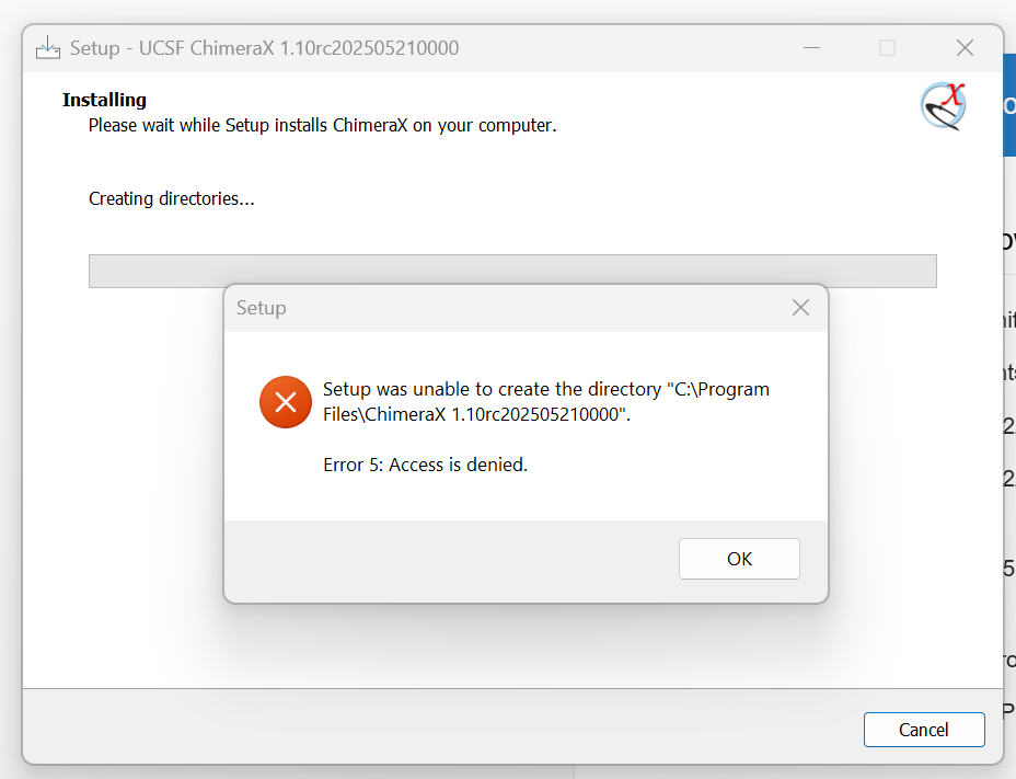 Hi Eric, Thanks for the pointer. I have got it installed, but it is misbehaving (see below). Any suggestions? Due to lack of permissions as you said, I tried installing here: Destination location: C:\Users\tblower\ChimeraX 1.10rc202505210000 It appeared to install fine I double-clicked the icon to get started - nothing happened. I deleted the folder and re-installed I double-clicked the icon again. This time the software did open. Then, it crashed. Double-clicking on the icon now produces: [https://attachment.freshservice.com/inline/attachment?token=eyJ0eXAiOiJKV1QiLCJhbGciOiJIUzI1NiJ9.eyJpZCI6MzEwMDY4NDkzMDQsImRvbWFpbiI6Im5ld2VuZ2xhbmRiaW9sYWJzaW5jLmZyZXNoc2VydmljZS5jb20iLCJ0eXBlIjoxfQ.iHAwXCDswILfUyh4v37RPpaRTOZA4QHmhe0CiliWhis] So it seems to have cleansed itself out of existence? I promise I am not being willfully ignorant, but I am at a loss. All help appreciated - thank you! Best wishes, Tim ________________________________ From: ChimeraX <ChimeraX-bugs-admin@cgl.ucsf.edu> Sent: Wednesday, May 21, 2025 12:10 PM To: Blower, Tim <tblower@neb.com>; pett@cgl.ucsf.edu <pett@cgl.ucsf.edu> Cc: gregc@cgl.ucsf.edu <gregc@cgl.ucsf.edu> Subject: Re: [ChimeraX] #17755: Possible bug on installation EXTERNAL SENDER #17755: Possible bug on installation --------------------------------+-------------------- Reporter: tblower@… | Owner: pett Type: defect | Status: closed Priority: normal | Milestone: Component: Platform | Version: Resolution: not a bug | Keywords: Blocked By: | Blocking: Notify when closed: | Platform: all Project: ChimeraX | --------------------------------+-------------------- Changes (by pett): * resolution: => not a bug * status: accepted => closed Comment: Hi Tim, Thanks for reporting this problem. The issue is that you don't have sufficient permissions to create a subfolder of C:\Program Files on the machine you're installing ChimeraX on. Your options are: 1) Change the permissions on C:\Program Files so that you can create subfolders 2) Run the installer as a user that does have permissions -or, most likely- 3) During an earlier step of the installer, choose an installation location that you do have permissions for. --Eric Eric Pettersen UCSF Computer Graphics Lab -- Ticket URL: <https://nam10.safelinks.protection.outlook.com/?url=https%3A%2F%2Fwww.rbvi.ucsf.edu%2Ftrac%2FChimeraX%2Fticket%2F17755%23comment%3A2&data=05%7C02%7Ctblower%40neb.com%7C86cf9fbaa8f24d9d0ba108dd98827de6%7C77cefbc6b3d64d6a9f740664881c384b%7C0%7C0%7C638834408426711156%7CUnknown%7CTWFpbGZsb3d8eyJFbXB0eU1hcGkiOnRydWUsIlYiOiIwLjAuMDAwMCIsIlAiOiJXaW4zMiIsIkFOIjoiTWFpbCIsIldUIjoyfQ%3D%3D%7C0%7C%7C%7C&sdata=JNHxChG7n9%2Fi9nRKMqYNBcDQSs%2FWNu9s2mB%2BWfwRnV8%3D&reserved=0<https://www.rbvi.ucsf.edu/trac/ChimeraX/ticket/17755#comment:2>> ChimeraX <https://nam10.safelinks.protection.outlook.com/?url=https%3A%2F%2Fwww.rbvi.ucsf.edu%2Fchimerax%2F&data=05%7C02%7Ctblower%40neb.com%7C86cf9fbaa8f24d9d0ba108dd98827de6%7C77cefbc6b3d64d6a9f740664881c384b%7C0%7C0%7C638834408426742957%7CUnknown%7CTWFpbGZsb3d8eyJFbXB0eU1hcGkiOnRydWUsIlYiOiIwLjAuMDAwMCIsIlAiOiJXaW4zMiIsIkFOIjoiTWFpbCIsIldUIjoyfQ%3D%3D%7C0%7C%7C%7C&sdata=zynUrcsOULw%2FmRVACo3MtorxlHoPXbt2Wy2oYikmPv4%3D&reserved=0<https://www.rbvi.ucsf.edu/chimerax/>> ChimeraX Issue Tracker