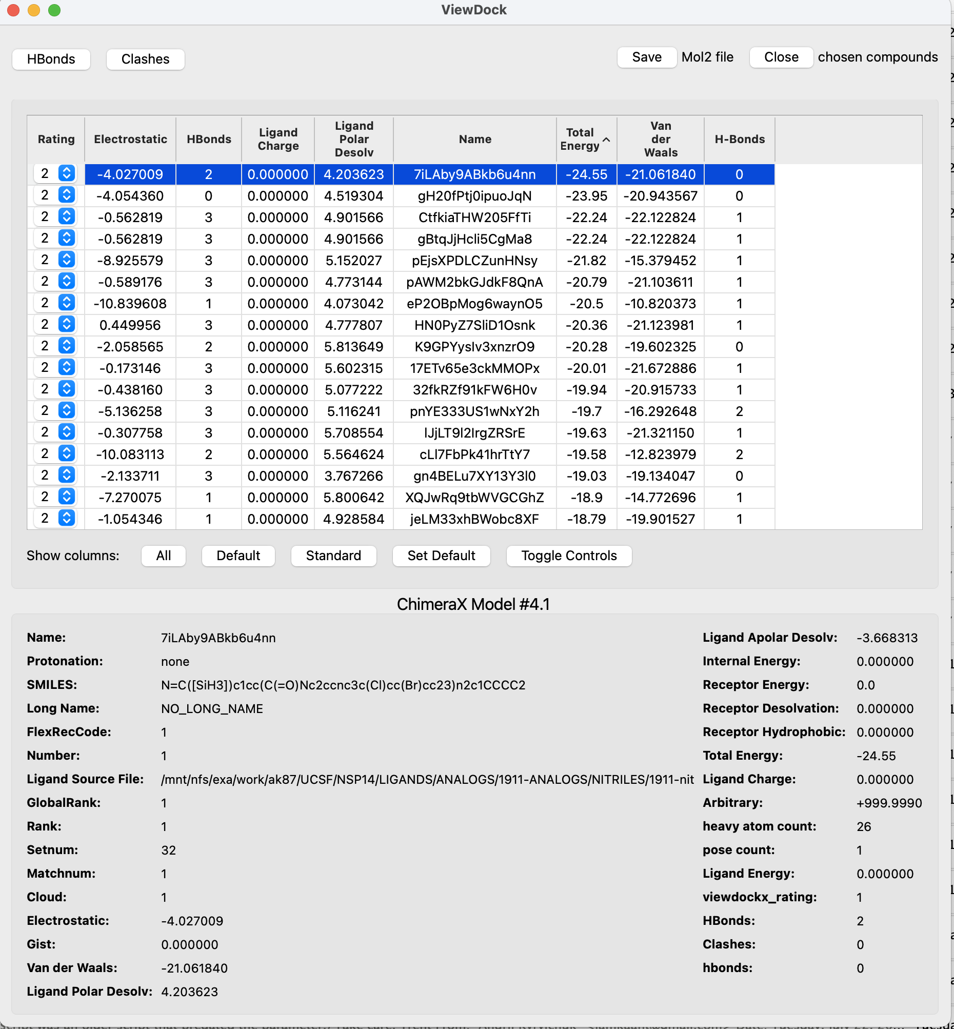 The rating system is still a bit inconvenient to use. A quick “OK/Bad” checkmark and fixed buttons to score the current ligand (as in classic Chimera) would speed up triaging. Dragging to each cell now slows review.