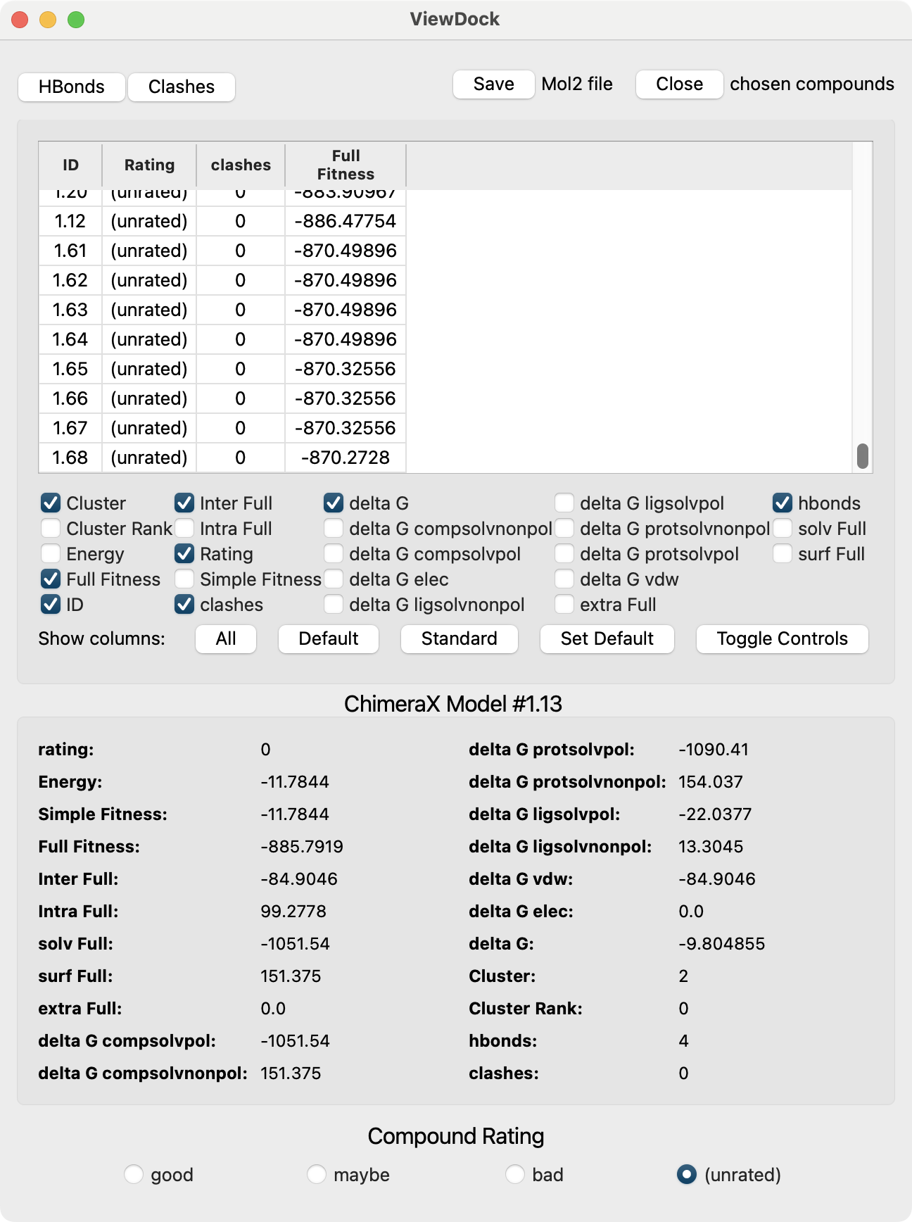 Session did not save which columns were shown (checkboxes seem correct but actual table contents were not those columns, see attached screenshot). For example, "hbonds" is checked but not shown, ditto for some of the descriptors that were in the docking file. I used the same data as in the ticket to add swissdock support to ViewDockX #4232. Besides the screenshot I also attached the session from the current daily build.