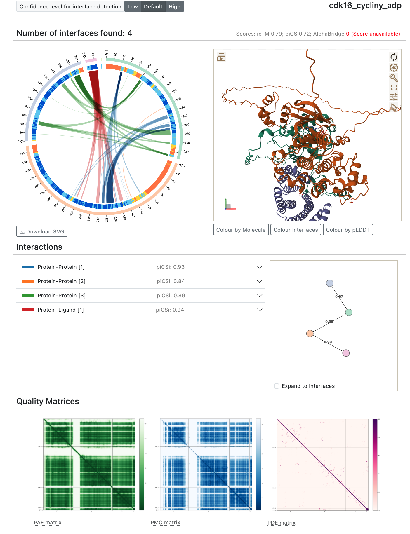 It would be nice if ChimeraX could display that kind of plot. It seems it would only need a structure and it doesn't need to be a predicted structure, any structure would do. The residues of all chains and ligands are laid out in a circle and lines connecting different residues are shown color differently for each interface. The Alphabridge plot gives scores for each interface. Those scores could be replaced by a variety of metrics such as buried surface area, number of hydrogen bonds, number of contacting residues, .... Might even provide a table of those interface statistics.