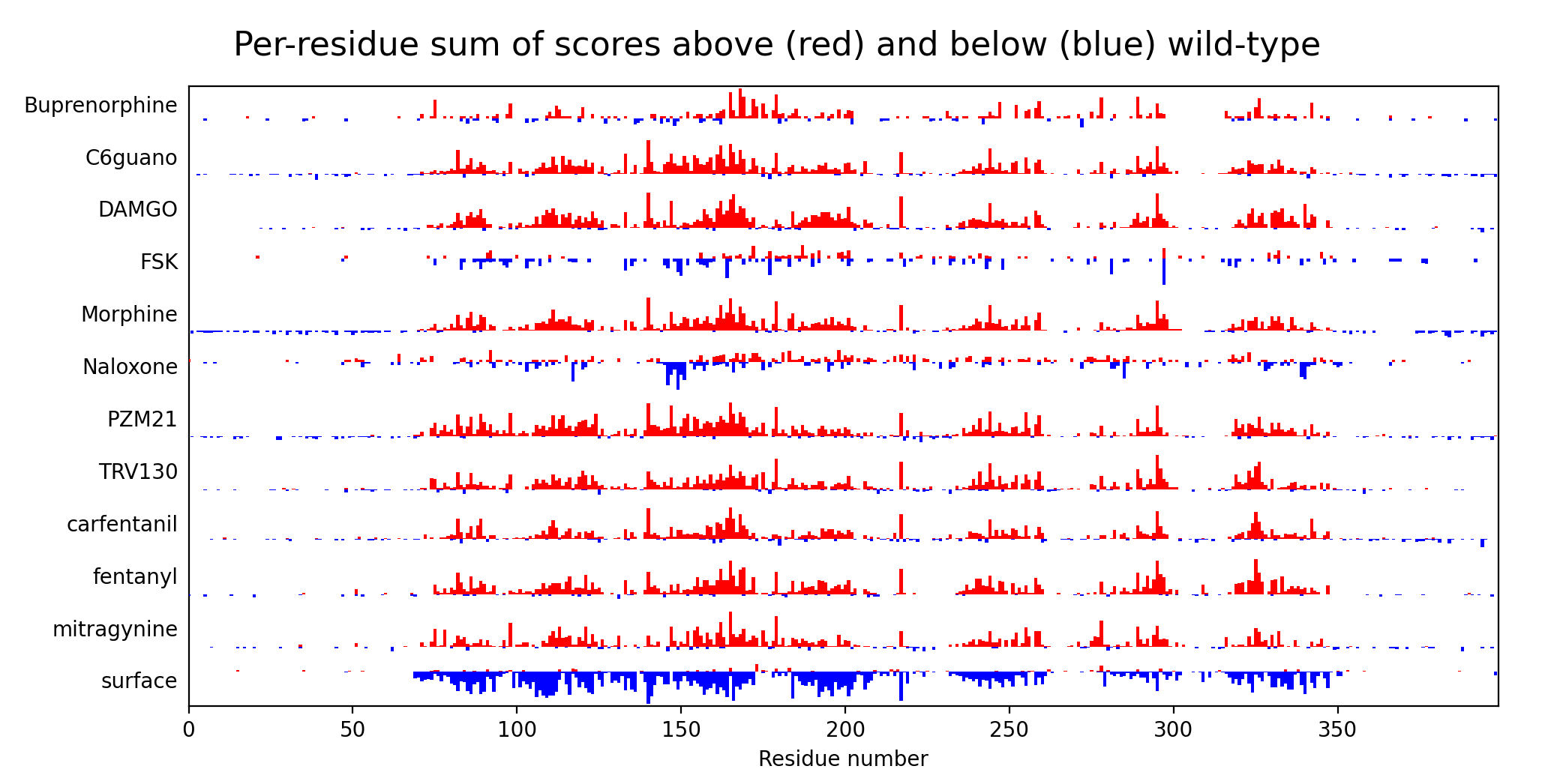 I was looking for a way to see an overview of the DMS scores when there are many different assays (12 for the opioid data). I tried plotting the per-residue scores, that is the sum of mutation scores at least 2 standard deviations above synonymous (red) and at least 2 standard deviations below synonymous (blue). I plot them as a bar graph for each assay with residue number along the horizontal axis. Attached is an image of this plot for the opiod data Willow and Matt Howard gave me that I made in ChimeraX with the attached script.