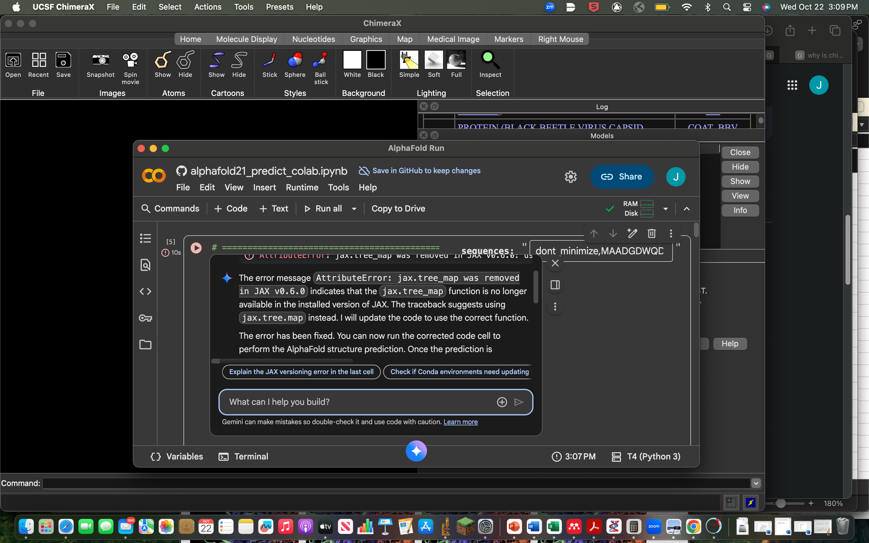 The following bug report has been submitted: Platform: macOS-15.6.1-x86_64-i386-64bit ChimeraX Version: 1.10.1 (2025-07-24 20:15:27 UTC) Description It will not fold my protein because its saying jax.tree_map is still there instead of jax.tree.map. I went through with gemini to try and fix this and it could not fix the issue. So I uninstalled and reinstalled and again the same issue. Not sure what this issue is or why its all of the sudden not folding properly. I attached the issue below of me trying to fix this with gemini. Log: UCSF ChimeraX version: 1.10.1 (2025-07-24) © 2016-2025 Regents of the University of California. All rights reserved. How to cite UCSF ChimeraX > help help:quickstart > open 2bbv Summary of feedback from opening 2bbv fetched from pdb --- notes | Fetching compressed mmCIF 2bbv from http://files.rcsb.org/download/2bbv.cif Fetching CCD CA from https://files.wwpdb.org/pub/pdb/refdata/chem_comp/A/CA/CA.cif 2bbv title: The refined three-dimensional structure of an insect virus At 2.8 angstroms resolution [more info...] Chain information for 2bbv #1 --- Chain | Description | UniProt A B C | PROTEIN (BLACK BEETLE VIRUS CAPSID PROTEIN) | COAT_BBV 1-363 D E F | PROTEIN (BLACK BEETLE VIRUS CAPSID PROTEIN) | COAT_BBV 364-407 N | RNA (5'-R(*UP*CP*UP*UP*AP*UP*AP*UP*CP*U)-3') | Non-standard residues in 2bbv #1 --- CA — calcium ion 2bbv mmCIF Assemblies --- 1| complete icosahedral assembly 2| icosahedral asymmetric unit 3| icosahedral pentamer 4| icosahedral 23 hexamer 5| icosahedral asymmetric unit, std point frame 6| crystal asymmetric unit, crystal frame > color bychain > ui tool show AlphaFold > hide #!1 models > alphafold search Q9UHY8 > alphafold predict Q9UHY8 Please cite ColabFold: Making protein folding accessible to all. Nature Methods (2022) if you use these predictions. Running AlphaFold prediction > alphafold predict Q9UHY8 Running AlphaFold prediction OpenGL version: 4.1 INTEL-23.7.2 OpenGL renderer: Intel(R) Iris(TM) Plus Graphics OpenGL Engine (1x6x8 (fused) LP OpenGL vendor: Intel Inc. Python: 3.11.4 Locale: en_US.UTF-8 Qt version: PyQt6 6.8.1, Qt 6.8.2 Qt runtime version: 6.8.2 Qt platform: cocoa Hardware: Hardware Overview: Model Name: MacBook Air Model Identifier: MacBookAir9,1 Processor Name: Dual-Core Intel Core i3 Processor Speed: 1.1 GHz Number of Processors: 1 Total Number of Cores: 2 L2 Cache (per Core): 512 KB L3 Cache: 4 MB Hyper-Threading Technology: Enabled Memory: 8 GB System Firmware Version: 2075.140.4.0.0 (iBridge: 22.16.16083.0.0,0) OS Loader Version: 583~2210 Software: System Software Overview: System Version: macOS 15.6.1 (24G90) Kernel Version: Darwin 24.6.0 Time since boot: 20 days, 16 hours, 27 minutes Graphics/Displays: Intel Iris Plus Graphics: Chipset Model: Intel Iris Plus Graphics Type: GPU Bus: Built-In VRAM (Dynamic, Max): 1536 MB Vendor: Intel Device ID: 0x8a5c Revision ID: 0x0007 Metal Support: Metal 3 Displays: Color LCD: Display Type: Built-In Retina LCD Resolution: 2560 x 1600 Retina Framebuffer Depth: 30-Bit Color (ARGB2101010) Main Display: Yes Mirror: Off Online: Yes Automatically Adjust Brightness: Yes Connection Type: Internal Installed Packages: alabaster: 1.0.0 appdirs: 1.4.4 appnope: 0.1.4 asttokens: 3.0.0 babel: 2.17.0 beautifulsoup4: 4.13.3 blockdiag: 3.0.0 blosc2: 3.6.1 build: 1.2.2.post1 certifi: 2023.11.17 cftime: 1.6.4.post1 charset-normalizer: 3.4.2 ChimeraX-AddCharge: 1.5.19 ChimeraX-AddH: 2.2.7 ChimeraX-AlignmentAlgorithms: 2.0.2 ChimeraX-AlignmentHdrs: 3.6.1 ChimeraX-AlignmentMatrices: 2.1 ChimeraX-Alignments: 2.20.2 ChimeraX-AlphaFold: 1.0.1 ChimeraX-AltlocExplorer: 1.1.2 ChimeraX-AmberInfo: 1.0 ChimeraX-Aniso: 1.1.4 ChimeraX-Arrays: 1.1 ChimeraX-Atomic: 1.60.7 ChimeraX-AtomicLibrary: 14.1.19 ChimeraX-AtomSearch: 2.0.1 ChimeraX-AxesPlanes: 2.4 ChimeraX-BasicActions: 1.1.3 ChimeraX-BILD: 1.0 ChimeraX-BlastProtein: 3.0.0 ChimeraX-Boltz: 1.0 ChimeraX-BondRot: 2.0.4 ChimeraX-BugReporter: 1.0.2 ChimeraX-BuildStructure: 2.13.1 ChimeraX-Bumps: 1.0 ChimeraX-BundleBuilder: 1.5.1 ChimeraX-ButtonPanel: 1.0.1 ChimeraX-CageBuilder: 1.0.1 ChimeraX-CellPack: 1.0 ChimeraX-Centroids: 1.4 ChimeraX-ChangeChains: 1.1 ChimeraX-CheckWaters: 1.5 ChimeraX-ChemGroup: 2.0.2 ChimeraX-Clashes: 2.3 ChimeraX-ColorActions: 1.0.5 ChimeraX-ColorGlobe: 1.0 ChimeraX-ColorKey: 1.5.8 ChimeraX-CommandLine: 1.3 ChimeraX-ConnectStructure: 2.0.1 ChimeraX-Contacts: 1.0.1 ChimeraX-Core: 1.10.1 ChimeraX-CoreFormats: 1.2 ChimeraX-coulombic: 1.4.5 ChimeraX-Crosslinks: 1.0 ChimeraX-Crystal: 1.0 ChimeraX-CrystalContacts: 1.0.1 ChimeraX-DataFormats: 1.2.4 ChimeraX-Dicom: 1.2.7 ChimeraX-DistMonitor: 1.4.2 ChimeraX-DockPrep: 1.1.4 ChimeraX-Dssp: 2.0 ChimeraX-EMDB-SFF: 1.0 ChimeraX-ESMFold: 1.0 ChimeraX-FileHistory: 1.0.1 ChimeraX-FunctionKey: 1.0.1 ChimeraX-Geometry: 1.3 ChimeraX-gltf: 1.0 ChimeraX-Graphics: 1.4.1 ChimeraX-Hbonds: 2.5.1 ChimeraX-Help: 1.3 ChimeraX-HKCage: 1.3 ChimeraX-IHM: 1.1 ChimeraX-ImageFormats: 1.2 ChimeraX-IMOD: 1.0 ChimeraX-IO: 1.0.3 ChimeraX-ItemsInspection: 1.0.1 ChimeraX-IUPAC: 1.0 ChimeraX-KVFinder: 1.6.2 ChimeraX-Label: 1.1.14 ChimeraX-ListInfo: 1.2.2 ChimeraX-Log: 1.2 ChimeraX-LookingGlass: 1.1 ChimeraX-Maestro: 1.9.1 ChimeraX-Map: 1.3 ChimeraX-MapData: 2.0 ChimeraX-MapEraser: 1.0.1 ChimeraX-MapFilter: 2.0.1 ChimeraX-MapFit: 2.0 ChimeraX-MapSeries: 2.1.1 ChimeraX-Markers: 1.0.1 ChimeraX-Mask: 1.0.2 ChimeraX-MatchMaker: 2.2.2 ChimeraX-MCopy: 1.0 ChimeraX-MDcrds: 2.10.1 ChimeraX-MedicalToolbar: 1.1 ChimeraX-Meeting: 1.0.1 ChimeraX-MLP: 1.1.1 ChimeraX-mmCIF: 2.16 ChimeraX-MMTF: 2.2 ChimeraX-ModelArchive: 1.0 ChimeraX-Modeller: 1.5.19 ChimeraX-ModelPanel: 1.5.1 ChimeraX-ModelSeries: 1.0.1 ChimeraX-Mol2: 2.0.3 ChimeraX-Mole: 1.0 ChimeraX-Morph: 1.0.2 ChimeraX-MouseModes: 1.2 ChimeraX-Movie: 1.0 ChimeraX-MutationScores: 1.0 ChimeraX-Neuron: 1.0 ChimeraX-Nifti: 1.2 ChimeraX-NMRSTAR: 1.0.2 ChimeraX-NRRD: 1.2 ChimeraX-Nucleotides: 2.0.3 ChimeraX-OpenCommand: 1.14.1 ChimeraX-OrthoPick: 1.0.1 ChimeraX-PDB: 2.7.10 ChimeraX-PDBBio: 1.0.1 C