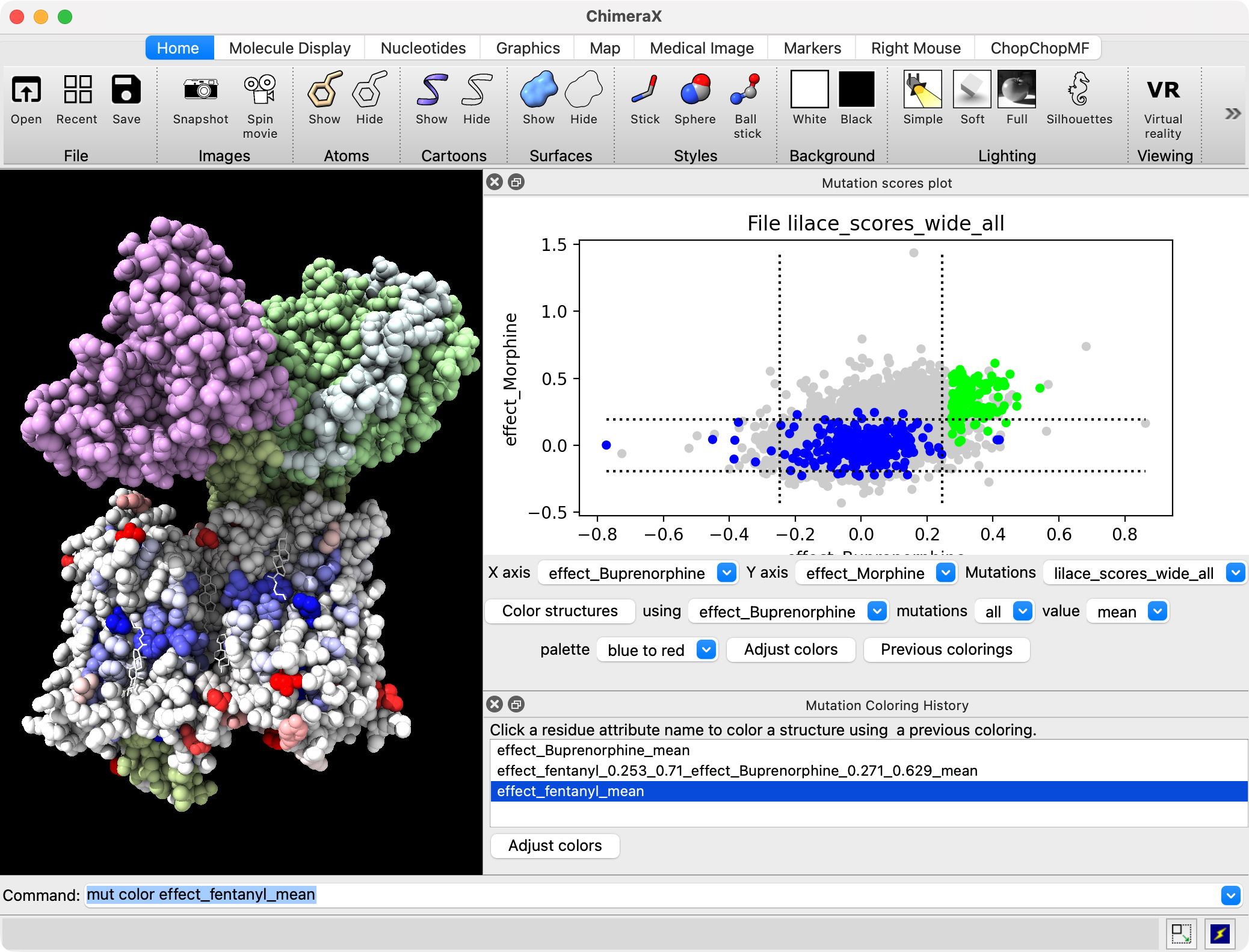 6) Add attribute table option to only color displayed structures. This will allow coloring only a fentanyl bound structure with fentanyl scores, and a morphine bound structure with morphine scores even though both structure are associated with all the mutation data.