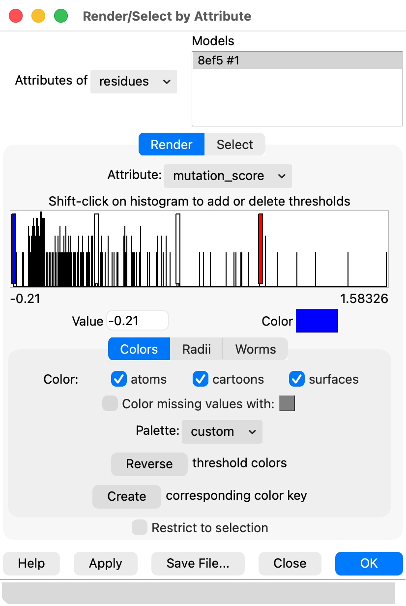 The Render by Attribute histogram shows the histogram bars in the wrong positions. In this example all the attribute values (named mutation_score) are greater than 0. But the left most histogram bar is appears to be near -0.21. Moving the leftmost threshold from -0.21 to 0 puts it to the right of many of the histogram bars, even though the attribute values are all > 0.