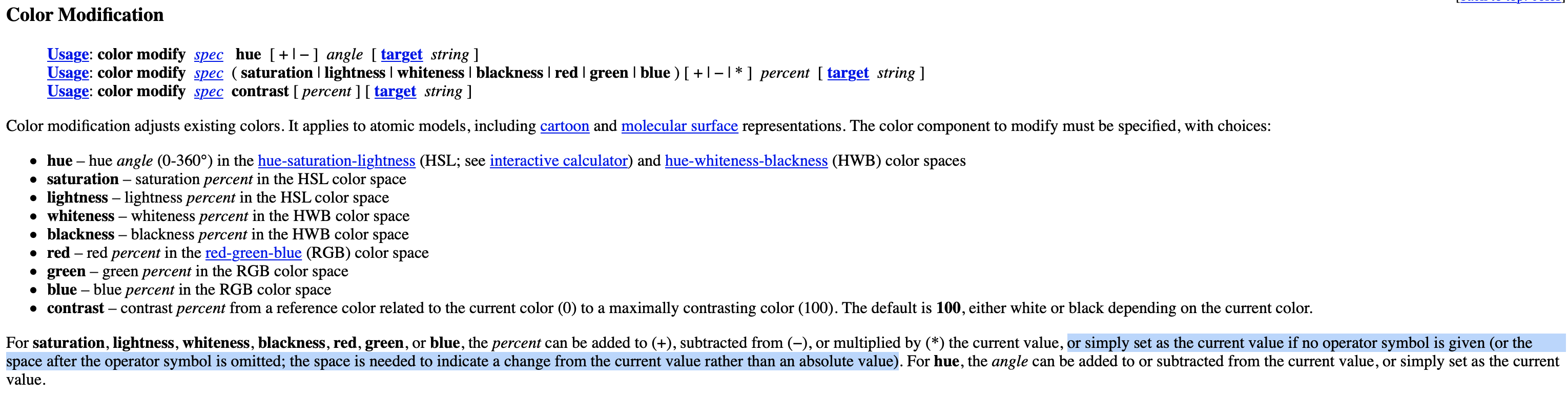 The following bug report has been submitted: Platform: Darwin-18.6.0-x86_64-i386-64bit ChimeraX Version: 0.91 (2019-06-07) Description Hi, The "color modify" command behaves strangely: https://www.dropbox.com/s/s6wwakr5zs05l7h/color_adjust.mov?dl=0 I would expect that these commands should be reversible, but it doesn't seem to be the case. For example, if I run "color modify sel whiteness 100" on a thing that was previously cornflower blue, it turns white - so far so sensible. But if I then run "color modify sel whiteness 1", it turns red. This is unexpected. If I run "color modify sel whiteness 1" on something that is initially cornflower blue, it does not become red - just a darker blue. I guess this is because of the definition of the HWB scheme but it is a little counterintuitive. Also, repeated commands like "color modify sel whiteness +5" do not do anything - the first command modifies whiteness by the requested amount, but subsequent commands don't anything - presumably the reference whiteness value is not being updated, so it is still setting to +5 vs the original value, rather than the updated value? I really like this concept by the way, and it seems like the kind of functionality that would be well served by a future GUI panel with sliders for each kind of modification to apply to the selection. Cheers Oli Log: > camera ortho > cofr centerOfView > volume voxelLimit 100000 showPlane false limitVoxelCount false voxelLimitForOpen 10000 > alias crosshairs_on log text crosshairs_on: diaplays crosshairs at center of rotation and places cofr at center of view; cofr centerofview showpivot 5,0.2 > alias crosshairs_off cofr centerofview showpivot false > alias cootmode volume style mesh step 1 squaremesh false meshlighting true twosidedlighting false capfaces false; surface cap false; size stickradius 0.05; ~rib; color gold target a; color byhet; lighting flat; lighting depthcuestart 0.2 depthcueend 0.7; set silhouettes false; set subdivision 1; crosshairs_on; color #3333851effff target s; style stick; set bgcolor black > alias cootmode_white volume style mesh step 1 squaremesh false meshlighting true twosidedlighting false capfaces false; surface cap false; size stickradius 0.05; ~rib; color orange target a; color byhet; lighting flat; lighting depthcuestart 0.2 depthcueend 0.7; set silhouettes false; set subdivision 1; crosshairs_on; color #00000000cccc target s; style stick; set bgcolor white > alias carve surface zone #* nearatoms sel distance $1 maxcomponents 1 > alias uncarve surface unzone #* > alias focus view cofr false UCSF ChimeraX version: 0.91 (2019-06-07) © 2016-2019 Regents of the University of California. All rights reserved. How to cite UCSF ChimeraX > open /Users/oliverclarke/Dropbox/Downloads/model_moved.pdb_modified.pdb Summary of feedback from opening /Users/oliverclarke/Dropbox/Downloads/model_moved.pdb_modified.pdb --- warnings | Duplicate atom serial number found: 819 Duplicate atom serial number found: 820 Duplicate atom serial number found: 821 Duplicate atom serial number found: 822 Duplicate atom serial number found: 823 103573 messages similar to the above omitted Chain information for model_moved.pdb_modified.pdb #1 --- Chain | Description A B G I | No description available F | No description available H J O | No description available > crosshairs_on crosshairs_on: diaplays crosshairs at center of rotation and places cofr at center of view > lighting simple > lighting full > lighting soft > set subdivision 10 > set subdivision 1 > cofr frontCenter > select /A:4871@CB 1 atom, 1 model selected > select up 9 atoms, 8 bonds, 1 model selected > style stick Changed 141366 atom styles > select up 4 atoms, 2 bonds, 1 model selected > select up 26 atoms, 26 bonds, 1 model selected > select up 347 atoms, 356 bonds, 1 model selected > cofr centerOfView showPivot 10,0.5 > color modify sel whiteness 50 > select clear > select /A:4174@CZ 1 atom, 1 model selected > select up 2 atoms, 1 bond, 1 model selected > select up 8 atoms, 7 bonds, 1 model selected > color modify sel whiteness +5 > color modify sel whiteness -5 > color modify sel whiteness -5 > color modify sel whiteness -5 > color modify sel whiteness -5 > color modify sel whiteness -5 > color modify sel whiteness -5 > color modify sel whiteness -5 > color modify sel whiteness +5 > color modify sel whiteness +5 > color modify sel whiteness +5 > color modify sel whiteness 50 > color modify sel whiteness 50 > color modify sel whiteness 50 > color modify sel whiteness +5 > color modify sel whiteness +5 > color modify sel whiteness +5 > color modify sel whiteness +5 > color modify sel whiteness +1 > color modify sel whiteness +0.5 > color modify sel whiteness -0.5 > select /G:4075@CD 1 atom, 1 model selected > select up 9 atoms, 8 bonds, 1 model selected > color modify sel whiteness +5 > color modify sel whiteness +5 > color modify sel whiteness +5 > color modify sel whiteness +5 > color modify sel whiteness +5 > color modify sel whiteness +5 > color modify sel whiteness +5 > color modify sel whiteness +5 > color modify sel whiteness +5 > color modify sel whiteness +5 > color modify sel whiteness +5 > color modify sel whiteness +5 > color modify sel whiteness -5 > color modify sel whiteness 50 > color modify sel whiteness 980 > color modify sel whiteness 1000 > color modify sel whiteness 1000 > color modify sel whiteness 1000 > color modify sel whiteness 100 > color modify sel whiteness 10 > color modify sel whiteness 10 > color modify sel whiteness 1 > color modify sel whiteness 4 > color modify sel whiteness 6 > select /I:4541@CD2 1 atom, 1 model selected > select up 14 atoms, 15 bonds, 1 model selected > color modify sel whiteness 6 > color modify sel whiteness 6 > color modify sel whiteness 6 > color modify sel whiteness 6 > color modify sel whiteness 6 > color modify sel whiteness 6 > color modify sel whiteness 1 > color modify sel whiteness 10 > color modify sel whiteness 10000 > color modify sel whiteness 10000