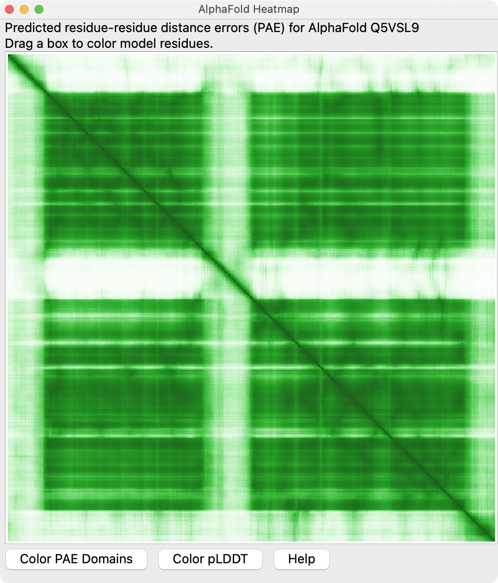I added the ability to show AlphaFold predicted aligned error as a heat map, and to color residues by domains determined by Tristan's networkx cluster code. The heat map display allows dragging a box around any region on the heat map to color the corresponding residues. This is copied from the AlphaFold database web pages, including the green color scheme for the heat map. To fetch the PAE matrix data from the AlphaFold database there is a new "pae" option to the alphafold fetch command, for example