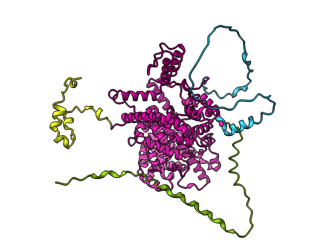 Domain coloring for AlphaFold database entry Q5VSL9 showing one core domain, and 3 disordered regions.