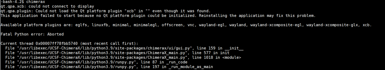 Hello Chimera Team, I ran chimerax in debug mode. Please see the output below: -bash-4.2$ export QT_DEBUG_PLUGINS=1 -bash-4.2$ chimerax QFactoryLoader::QFactoryLoader() checking directory path "/usr/libexec/UCSF-ChimeraX/lib/python3.9/site-packages/PyQt5/Qt/plugins/platforms" ... QFactoryLoader::QFactoryLoader() looking at "/usr/libexec/UCSF-ChimeraX/lib/python3.9/site-packages/PyQt5/Qt/plugins/platforms/libqeglfs.so" Found metadata in lib /usr/libexec/UCSF-ChimeraX/lib/python3.9/site-packages/PyQt5/Qt/plugins/platforms/libqeglfs.so, metadata= { "IID": "org.qt-project.Qt.QPA.QPlatformIntegrationFactoryInterface.5.3", "MetaData": { "Keys": [ "eglfs" ] }, "archreq": 0, "className": "QEglFSIntegrationPlugin", "debug": false, "version": 331520 } Got keys from plugin meta data ("eglfs") QFactoryLoader::QFactoryLoader() looking at "/usr/libexec/UCSF-ChimeraX/lib/python3.9/site-packages/PyQt5/Qt/plugins/platforms/libqlinuxfb.so" Found metadata in lib /usr/libexec/UCSF-ChimeraX/lib/python3.9/site-packages/PyQt5/Qt/plugins/platforms/libqlinuxfb.so, metadata= { "IID": "org.qt-project.Qt.QPA.QPlatformIntegrationFactoryInterface.5.3", "MetaData": { "Keys": [ "linuxfb" ] }, "archreq": 0, "className": "QLinuxFbIntegrationPlugin", "debug": false, "version": 331520 } Got keys from plugin meta data ("linuxfb") QFactoryLoader::QFactoryLoader() looking at "/usr/libexec/UCSF-ChimeraX/lib/python3.9/site-packages/PyQt5/Qt/plugins/platforms/libqminimal.so" Found metadata in lib /usr/libexec/UCSF-ChimeraX/lib/python3.9/site-packages/PyQt5/Qt/plugins/platforms/libqminimal.so, metadata= { "IID": "org.qt-project.Qt.QPA.QPlatformIntegrationFactoryInterface.5.3", "MetaData": { "Keys": [ "minimal" ] }, "archreq": 0, "className": "QMinimalIntegrationPlugin", "debug": false, "version": 331520 } Got keys from plugin meta data ("minimal") QFactoryLoader::QFactoryLoader() looking at "/usr/libexec/UCSF-ChimeraX/lib/python3.9/site-packages/PyQt5/Qt/plugins/platforms/libqminimalegl.so" Found metadata in lib /usr/libexec/UCSF-ChimeraX/lib/python3.9/site-packages/PyQt5/Qt/plugins/platforms/libqminimalegl.so, metadata= { "IID": "org.qt-project.Qt.QPA.QPlatformIntegrationFactoryInterface.5.3", "MetaData": { "Keys": [ "minimalegl" ] }, "archreq": 0, "className": "QMinimalEglIntegrationPlugin", "debug": false, "version": 331520 } Got keys from plugin meta data ("minimalegl") QFactoryLoader::QFactoryLoader() looking at "/usr/libexec/UCSF-ChimeraX/lib/python3.9/site-packages/PyQt5/Qt/plugins/platforms/libqoffscreen.so" Found metadata in lib /usr/libexec/UCSF-ChimeraX/lib/python3.9/site-packages/PyQt5/Qt/plugins/platforms/libqoffscreen.so, metadata= { "IID": "org.qt-project.Qt.QPA.QPlatformIntegrationFactoryInterface.5.3", "MetaData": { "Keys": [ "offscreen" ] }, "archreq": 0, "className": "QOffscreenIntegrationPlugin", "debug": false, "version": 331520 } Got keys from plugin meta data ("offscreen") QFactoryLoader::QFactoryLoader() looking at "/usr/libexec/UCSF-ChimeraX/lib/python3.9/site-packages/PyQt5/Qt/plugins/platforms/libqvnc.so" Found metadata in lib /usr/libexec/UCSF-ChimeraX/lib/python3.9/site-packages/PyQt5/Qt/plugins/platforms/libqvnc.so, metadata= { "IID": "org.qt-project.Qt.QPA.QPlatformIntegrationFactoryInterface.5.3", "MetaData": { "Keys": [ "vnc" ] }, "archreq": 0, "className": "QVncIntegrationPlugin", "debug": false, "version": 331520 } Got keys from plugin meta data ("vnc") QFactoryLoader::QFactoryLoader() looking at "/usr/libexec/UCSF-ChimeraX/lib/python3.9/site-packages/PyQt5/Qt/plugins/platforms/libqwayland-egl.so" Found metadata in lib /usr/libexec/UCSF-ChimeraX/lib/python3.9/site-packages/PyQt5/Qt/plugins/platforms/libqwayland-egl.so, metadata= { "IID": "org.qt-project.Qt.QPA.QPlatformIntegrationFactoryInterface.5.3", "MetaData": { "Keys": [ "wayland-egl" ] }, "archreq": 0, "className": "QWaylandEglPlatformIntegrationPlugin", "debug": false, "version": 331520 } Got keys from plugin meta data ("wayland-egl") QFactoryLoader::QFactoryLoader() looking at "/usr/libexec/UCSF-ChimeraX/lib/python3.9/site-packages/PyQt5/Qt/plugins/platforms/libqwayland-generic.so" Found metadata in lib /usr/libexec/UCSF-ChimeraX/lib/python3.9/site-packages/PyQt5/Qt/plugins/platforms/libqwayland-generic.so, metadata= { "IID": "org.qt-project.Qt.QPA.QPlatformIntegrationFactoryInterface.5.3", "MetaData": { "Keys": [ "wayland" ] }, "archreq": 0, "className": "QWaylandIntegrationPlugin", "debug": false, "version": 331520 } Got keys from plugin meta data ("wayland") QFactoryLoader::QFactoryLoader() looking at "/usr/libexec/UCSF-ChimeraX/lib/python3.9/site-packages/PyQt5/Qt/plugins/platforms/libqwayland-xcomposite-egl.so" Found metadata in lib /usr/libexec/UCSF-ChimeraX/lib/python3.9/site-packages/PyQt5/Qt/plugins/platforms/libqwayland-xcomposite-egl.so, metadata= { "IID": "org.qt-project.Qt.QPA.QPlatformIntegrationFactoryInterface.5.3", "MetaData": { "Keys": [ "wayland-xcomposite-egl" ] }, "archreq": 0, "className": "QWaylandXCompositeEglPlatformIntegrationPlugin", "debug": false, "version": 331520 } Got keys from plugin meta data ("wayland-xcomposite-egl") QFactoryLoader::QFactoryLoader() looking at "/usr/libexec/UCSF-ChimeraX/lib/python3.9/site-packages/PyQt5/Qt/plugins/platforms/libqwayland-xcomposite-glx.so" Found metadata in lib /usr/libexec/UCSF-ChimeraX/lib/python3.9/site-packages/PyQt5/Qt/plugins/platforms/libqwayland-xcomposite-glx.so, metadata= { "IID": "org.qt-project.Qt.QPA.QPlatformIntegrationFactoryInterface.5.3", "MetaData": { "Keys": [ "wayland-xcomposite-glx" ] }, "archreq": 0, "className": "QWaylandXCompositeGlxPlatformIntegrationPlugin", "debug": false, "version": 331520 } Got keys from plugin meta data ("wayland-xcomposite-glx") QFactoryLoader::QFactoryLoader() looking at "/usr/libexec/UCSF-ChimeraX/lib/python3.9/site-packages/PyQt5/Qt/plugins/platforms/libqxcb.so" Found metadata in lib /usr/libexec/UCSF-ChimeraX/lib/python3.9/site-packages/PyQt5/Qt/plugins/platforms/libqxcb.so, metadata= { "IID": "org.qt-project.Qt.QPA.QP