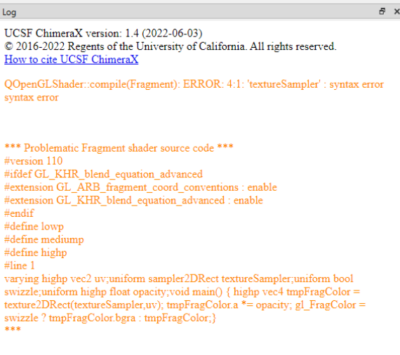 Hi Eric I upgraded to ChimeraX 1.4 but the problem is still there. The log window now displays a message which is found in the attached image. What should I do now? Thanks in advance for your help. Mariella -----Original Message----- From: ChimeraX <ChimeraX-bugs-admin@cgl.ucsf.edu> Sent: onsdag 31. august 2022 20:30 Cc: goddard@cgl.ucsf.edu; Mariella Evelyn Güere <mariella.evelyn.guere@nmbu.no>; pett@cgl.ucsf.edu Subject: Re: [ChimeraX] #7531: Menus obscured [You don't often get email from chimerax-bugs-admin@cgl.ucsf.edu. Learn why this is important at https://aka.ms/LearnAboutSenderIdentification ] #7531: Menus obscured -------------------------------------+---------------------- Reporter: mariguer@… | Owner: pett Type: defect | Status: feedback Priority: normal | Milestone: Component: Window Toolkit | Version: Resolution: | Keywords: Blocked By: | Blocking: Notify when closed: | Platform: all Project: ChimeraX | -------------------------------------+---------------------- Changes (by pett): * status: accepted => feedback Comment: Hi Mariella, Thanks for reporting this problem. I would recommend upgrading to the ChimeraX 1.4 release, which uses an entirely new version of the Qt windowing toolkit and therefore has a decent chance of fixing this problem without you doing anything else. Let me know if it helps. --Eric Eric Pettersen UCSF Computer Graphics Lab -- Ticket URL: <https://www.rbvi.ucsf.edu/trac/ChimeraX/ticket/7531#comment:2> ChimeraX <https://www.rbvi.ucsf.edu/chimerax/> ChimeraX Issue Tracker