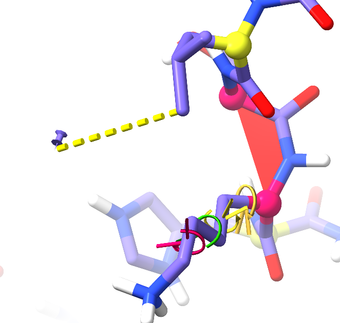 - torsion restraints ("calipers" around each axial bond indicating the distance from the target by both colour and angle)